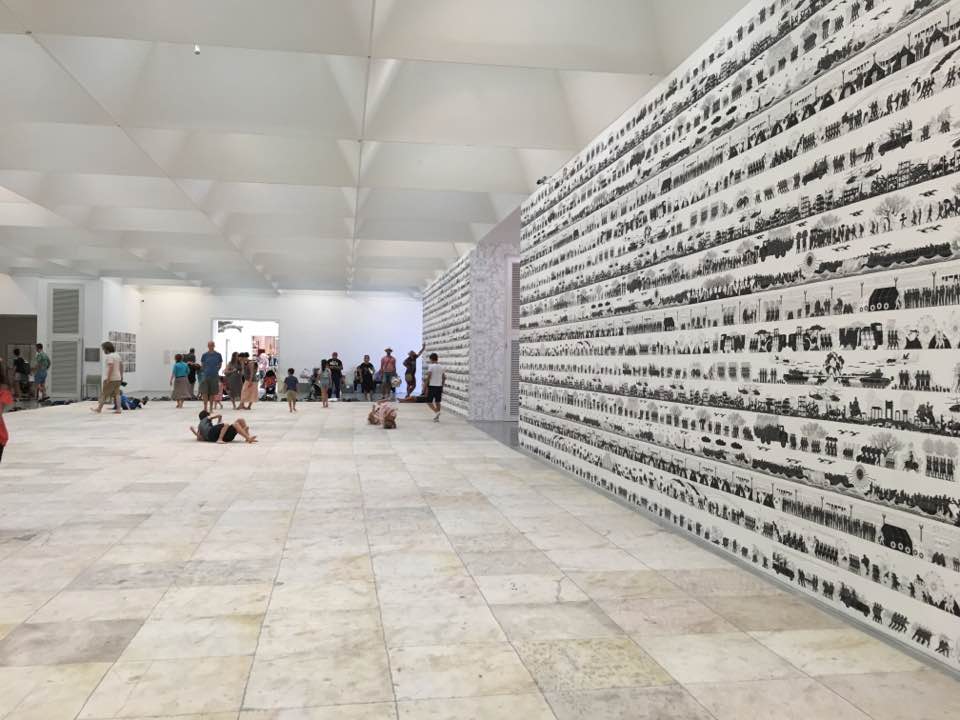 Следующий зал – огромный ковер, сотканный вручную целой армией помощников, и стены, обклеенные обоями с бесконечной чередой военных сюжетов разных эпох – от античности до наших дней. Ковер и обои – аллюзия на историю расправы нацистского режима с «дегенеративным искусством» и последовавшими за этим событиями, приведшими в конечном счете к самой страшной войне в истории человечества….