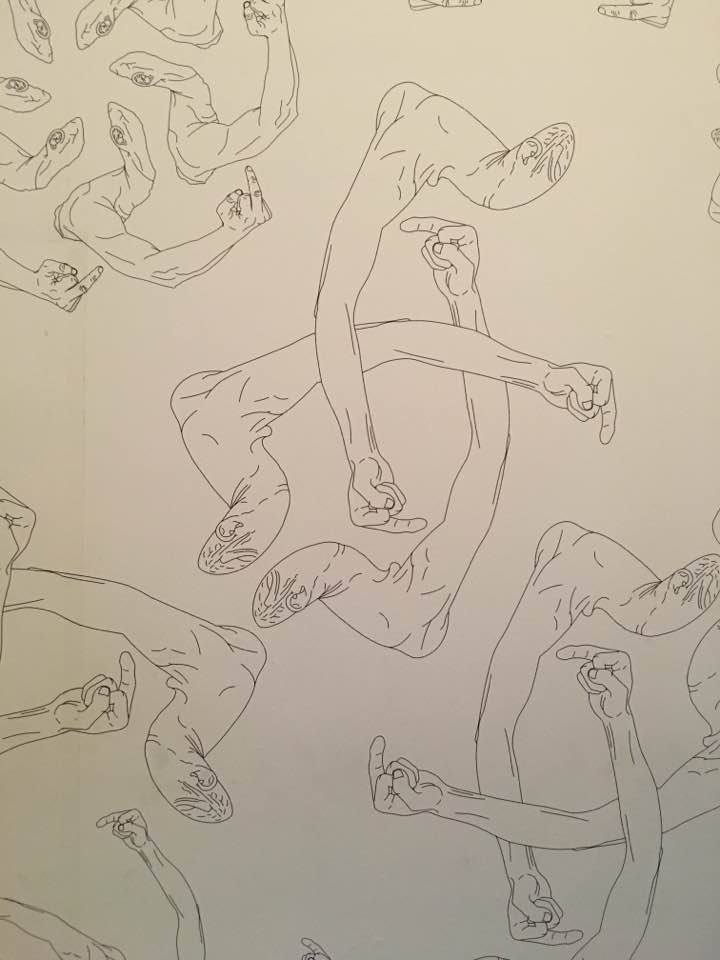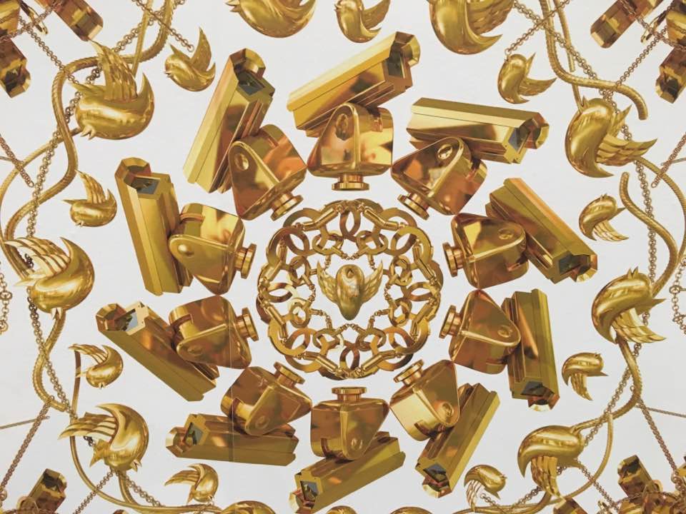 Кстати, стены всех залов выставки обклеены обоями – картинами, несущими в себе важную смысловую нагрузку. Здесь и рукоухие фигуры с оттопыренным пальцем, которые можно трактовать и как вызов обществу, и как готовность прислушиваться к мнению «вышестоящих товарищей», что-то вроде более привычной нам «фиги в кармане». Здесь и золотые барочные фото-композиции во всю стену: стоит присмотреться, и увидишь, что все эти вычурные орнаменты составлены из изображений видеокамер и наручников – символов несвободы и тотальной слежки в духе «Большого брата».