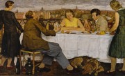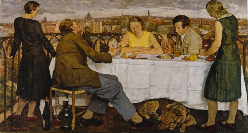 Название выставки «Сумерки над Берлином» – символическое и говорящее. Оно навеяно одной из картин, представленной в экспозиции. Это работа немецкой художницы Лотты Лазерштейн «Сумерки над Потсдамом» 1930 года. На картине изображены пять человек. Судя по всему, они только что закончили обедать и ведут разговор на балконе, с которого открывается вид на вечерний Потсдам. Только вот тема разговора не похожа на непринужденные застольные беседы за десертом и вином. Все пятеро чем-то глубоко озабочены, словно предчувствуя грядущую беду.