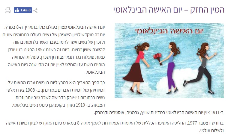Впрочем, в остальные годы это обычный рабочий день, хотя присутствие праздника ощущается все больше и больше. Это произошло во многом благодаря «Большой алие» из бывшего СССР, где 8 марта был государственным праздником. Как же отмечают в Израиле этот день и каково в целом положение женщин в нашей стране в первые два десятилетия 21 века?