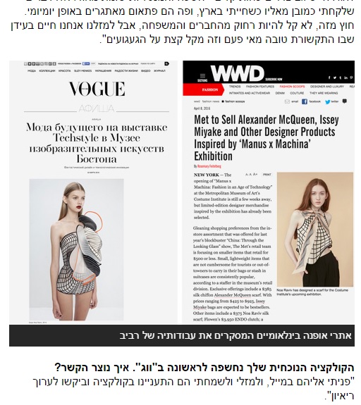 Первую коллекцию Ноа Равив назвала Hard Copy – в этом названии отразилась ее признательность 3D – печати, благодаря которой она состоялась в качестве самостоятельного и очень интересного модельера. Именно из этой коллекции два платья удостоились чести быть выставленными в The Metropolitan Museum of Art. Эта коллекция стала краеугольным камнем выбранного ею направления, в котором, по ее собственным словам, сочетается конструкция, логика и геометрия.