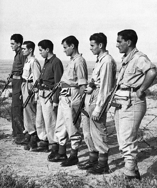 РУ: Еврейские бойцы только что созданной Армии обороны Израиля, отстоявшие независимость страны в 1948 году. Все они не имели боевого опыта и самую первичную военную подготовку прошли в рамках подпольных еврейских организаций «Хагана» и «Эцель», боровшихся с британским мандатом.